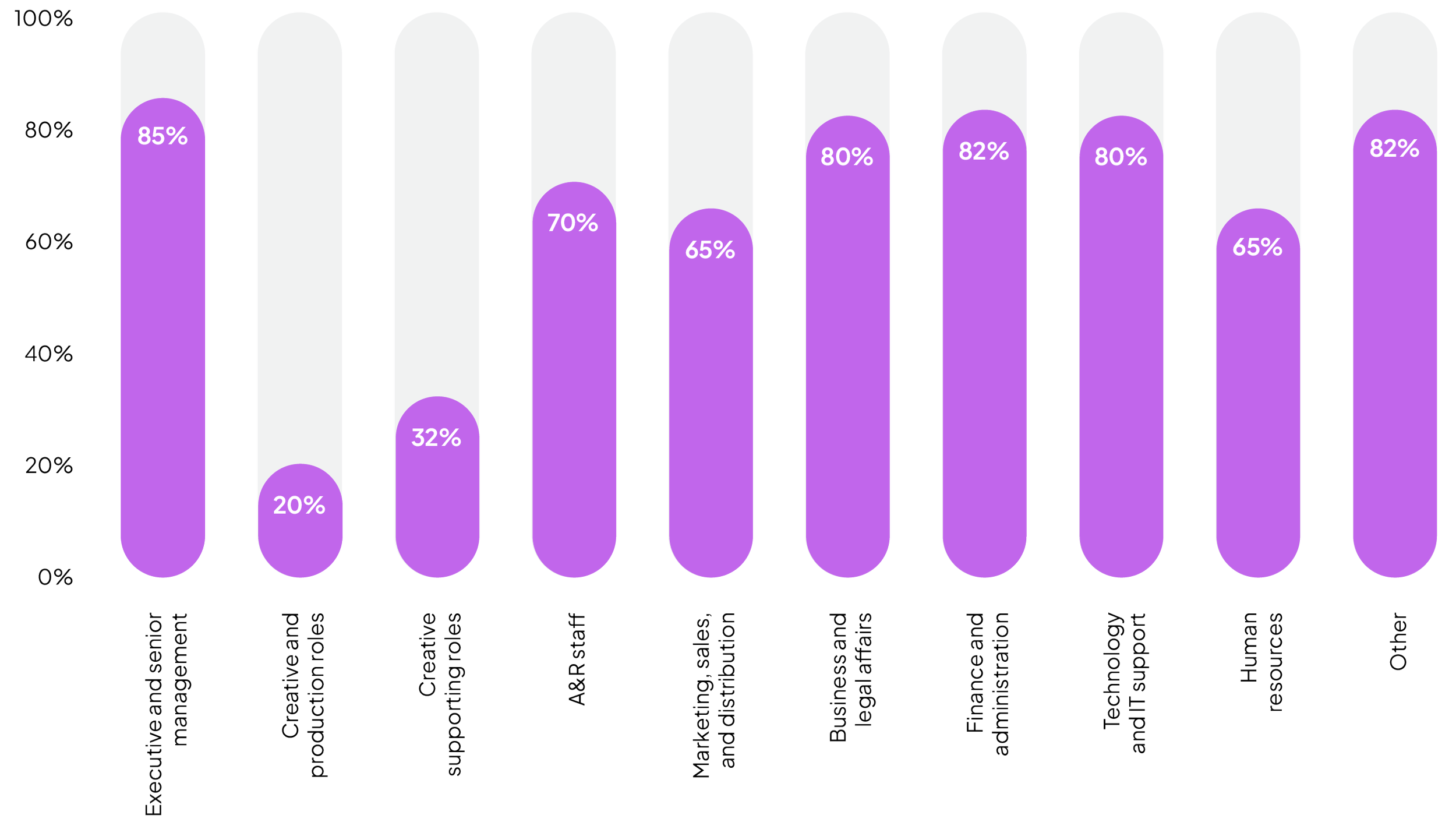 A closer look at department-level data in our analysis shows (see figure below) that gender representation varies among participating labels. Women are well‑represented in departments such as Business and Legal Affairs (61%), Marketing, Sales, and Distribution (56%), A&R (50%), Human Resources (50%), and Other roles (52%).